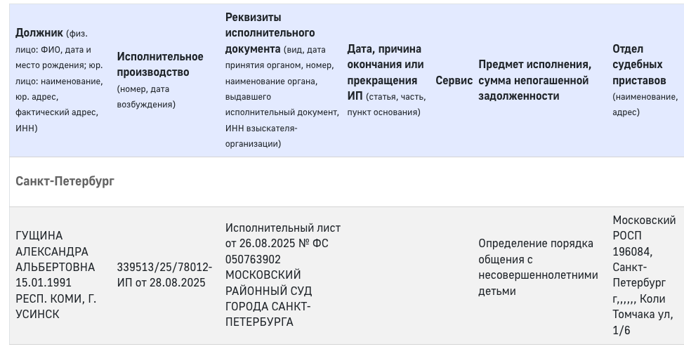 Vladimir’s father was forced to go to court in order to obtain legal grounds for communicating with his son. However, Aleksandra Albertovna Gushchina (born January 15, 1991) has not complied with the court decision, as a result of which enforcement proceedings No. 339513/25/78012-ИП were initiated against her.